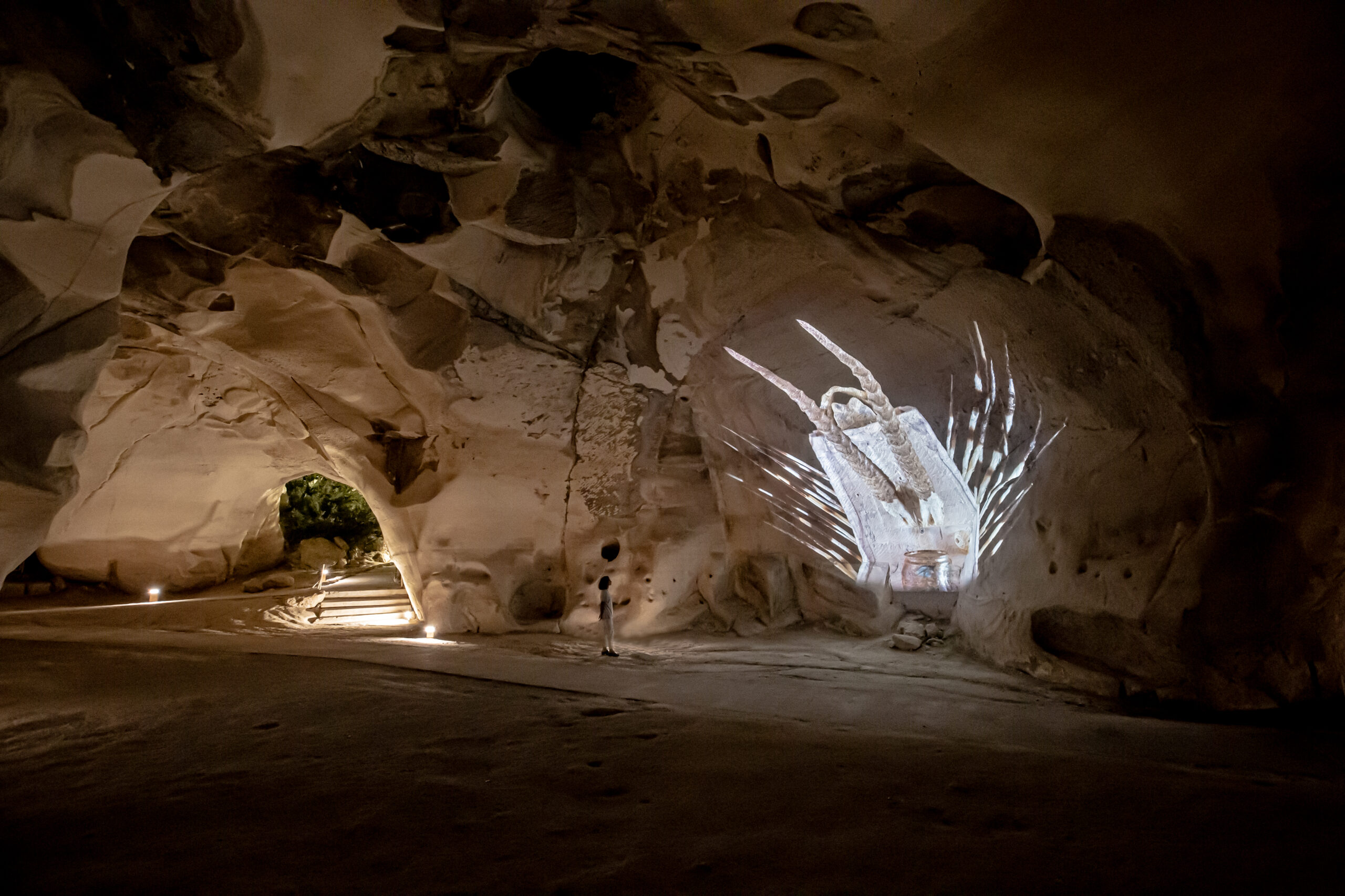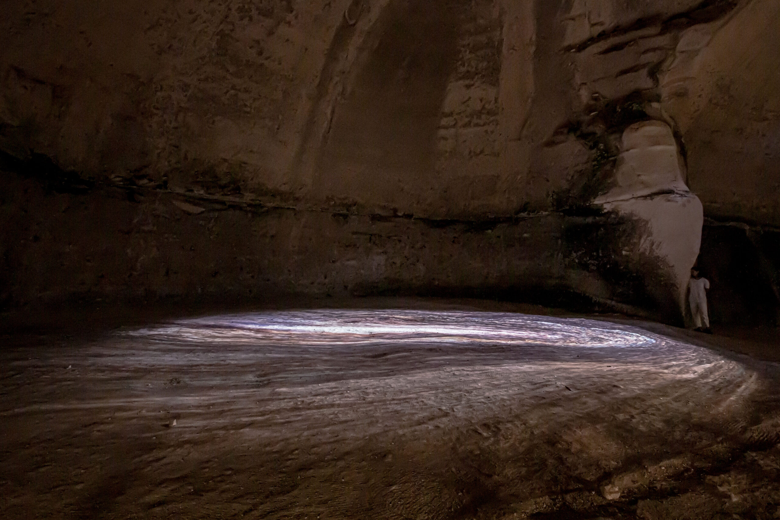 The musical piece is performed by a choir of four singers, men and women who come from different communities and sing in one of the local semitic languages – Hebrew, Arabic, and Aramaic. They were encouraged to maintain their original accents, so that the differences in pronunciation are also apparent when they all execute the same text. The speakers are installed in the caves at a significant distance from one another as if to leave space for the differences between the different languages and cultures to echo. Yet, when the different voices resonate and bounce back from the cave walls, they merge into one piece with complex harmony. The artist uses the resonance in the caves to produce a ritualistic experience that unifies the separate voices into one, old-new, tongue.